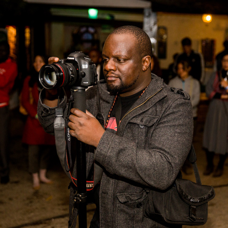 Left to right: Steve 64 (Ketebul Music Sound Engineer), Michael Kinyany Hunter Allen (Videographer Abubilla)